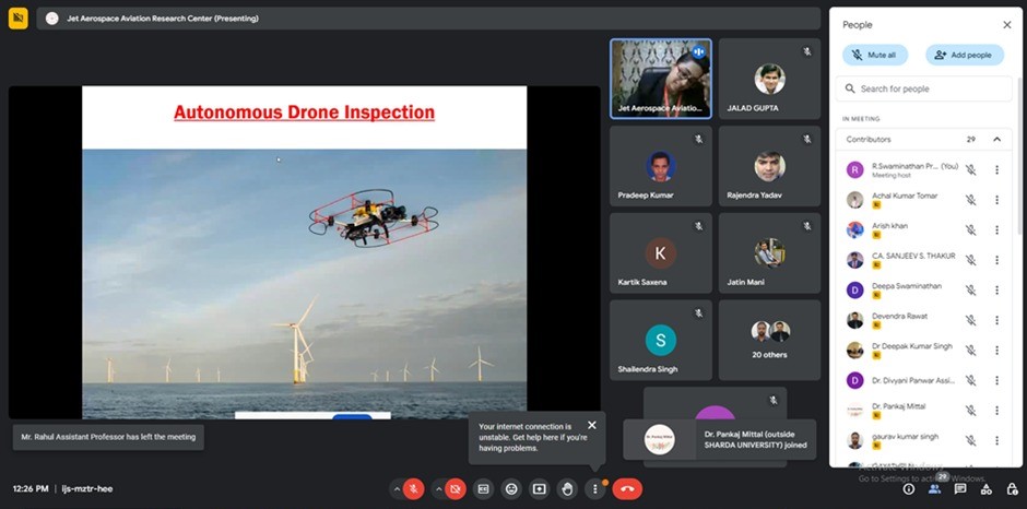 Anand School of Engineering and Technology Agra recently celebrated World Wind Day by organizing a successful webinar on "Wind Turbine Monitoring Using Drones" Held on Saturday, June 15, 2024, the event commenced at 11:30 AM and featured a keynote presentation by Ms. Krithiga, CEO of Jet Aerospace Group of Companies. Her insightful talk highlighted the integration of drone technology in the monitoring and maintenance of wind turbines, emphasizing the potential for increased efficiency and reduced downtime in renewable energy systems. The webinar was graced by the presence of Chief Patron Prof. (Dr.) Jayanthi Ranjan, Vice Chancellor of Sharda University Agra, and Patron Prof. (Dr.) R. Swaminathan, Dean of ASET, underscoring the institution's dedication to fostering innovative solutions in renewable energy. The event received positive feedback from participants, marking a significant contribution to the discourse on sustainable energy technologies.
